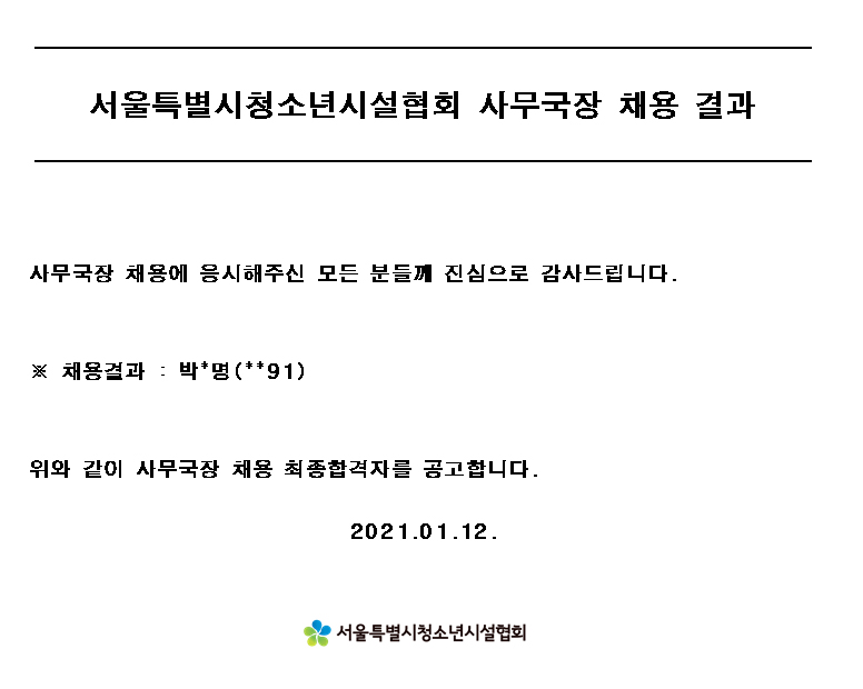 | ¼¿ïƯº°½Ãû¼Ò³â½Ã¼³Çùȸ »ç¹«±¹Àå ä¿ë °á°ú | |||