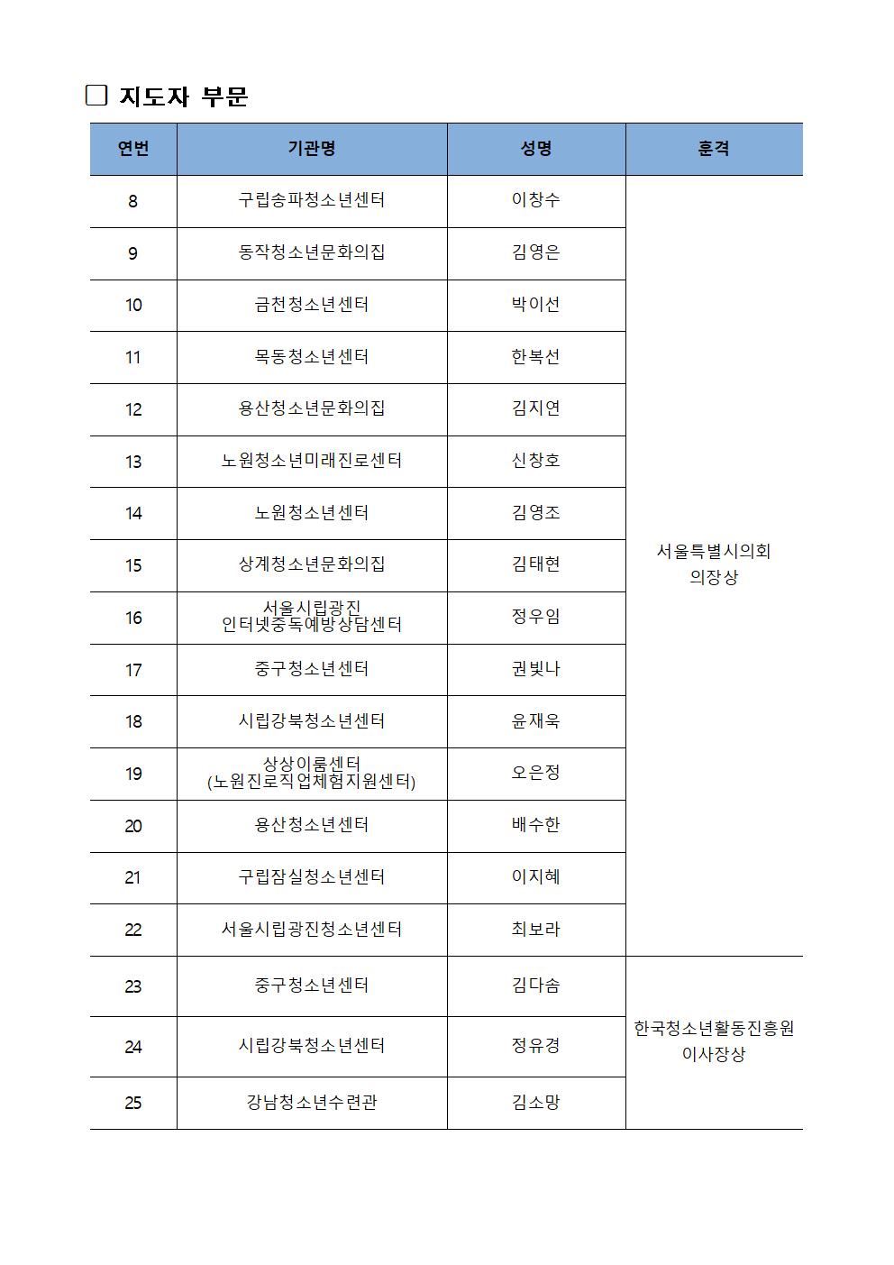 | 2021³â [¿ì¼öû¼Ò³â½Ã¼³ ¹× ¿ì¼öû¼Ò³âÁöµµÀÚ] Æ÷»ó ¼±Á¤ °á°ú | |||