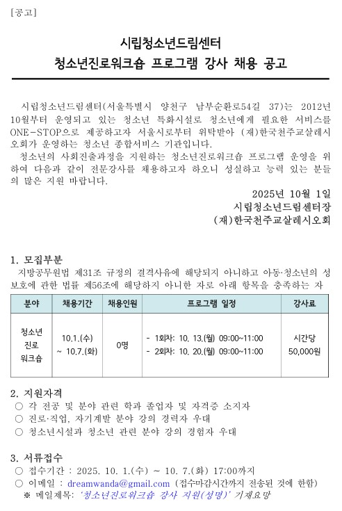 ÀÛ¼ºÀÚ : ½Ã¸³Ã»¼Ò³âµå¸²¼¾ÅÍ(dreamwanda@gmail.com) ÀÛ¼ºÀÏ : 2025-10-01 Á¶È¸¼ö : 80 | |||