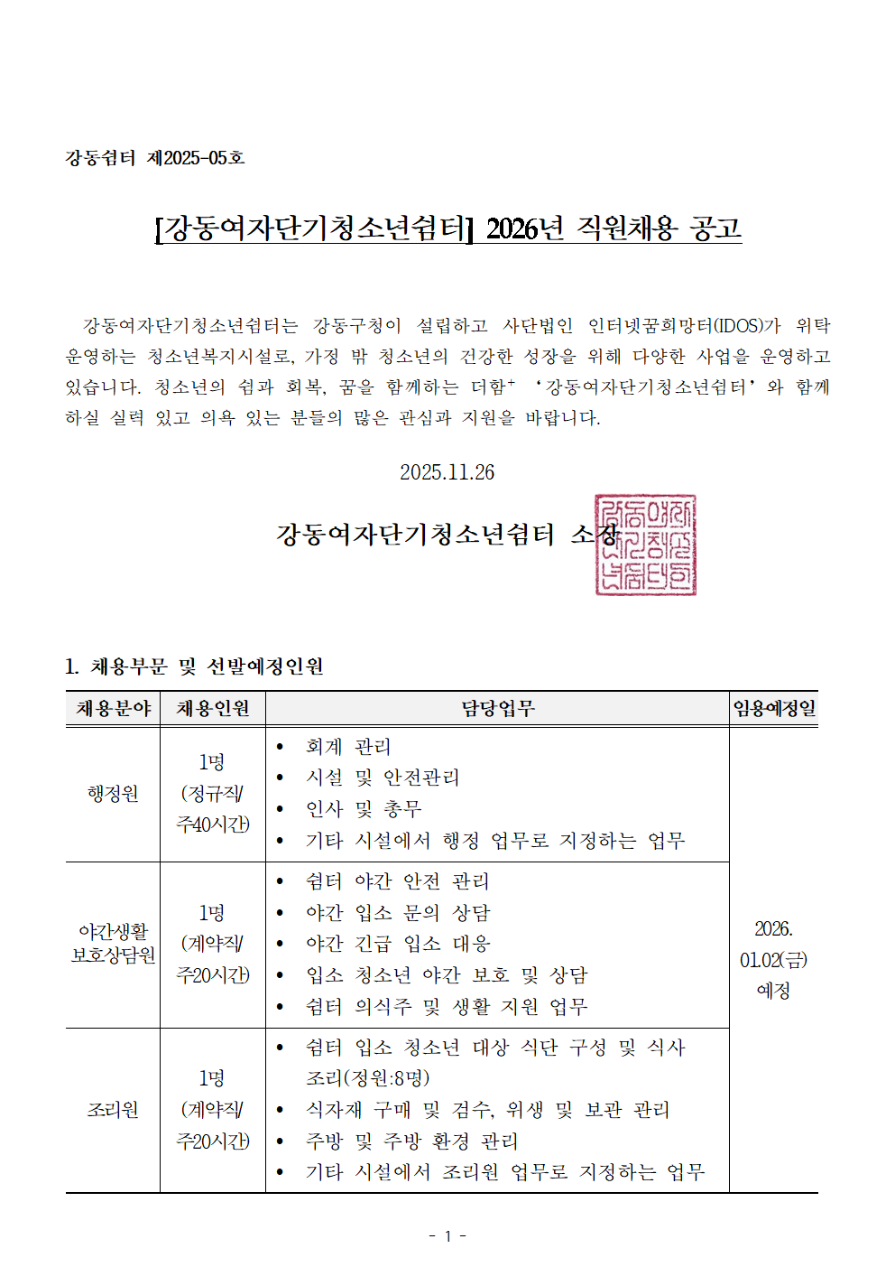 | [±¸ÀÎ] °µ¿¿©Àڴܱâû¼Ò³â½°ÅÍ 2026³â Á÷¿øÃ¤¿ë | |||