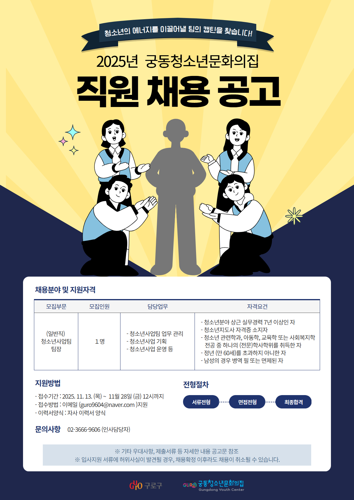 | [±¸ÀÎ] [²ø¾î¿Ã¸²] ±Ãµ¿Ã»¼Ò³â¹®ÈÀÇÁý Á÷¿øÃ¤¿ë Àç°ø°í(û¼Ò³â»ç¾÷ÆÀ ÆÀÀå) | |||