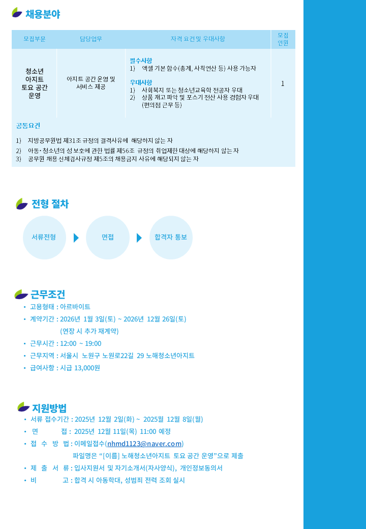 | ÀÌÀü±Û | [½Ã¸³È°îû¼Ò³â¼¾ÅÍ] û¼Ò³â»ç¾÷ÆÀ û¼Ò³â¹èÄ¡Áöµµ»ç/°è¾àÁ÷ ¹× ¹æ°úÈľÆÄ«µ¥¹Ì PM/°è¾àÁ÷ ä¿ë °ø°í |