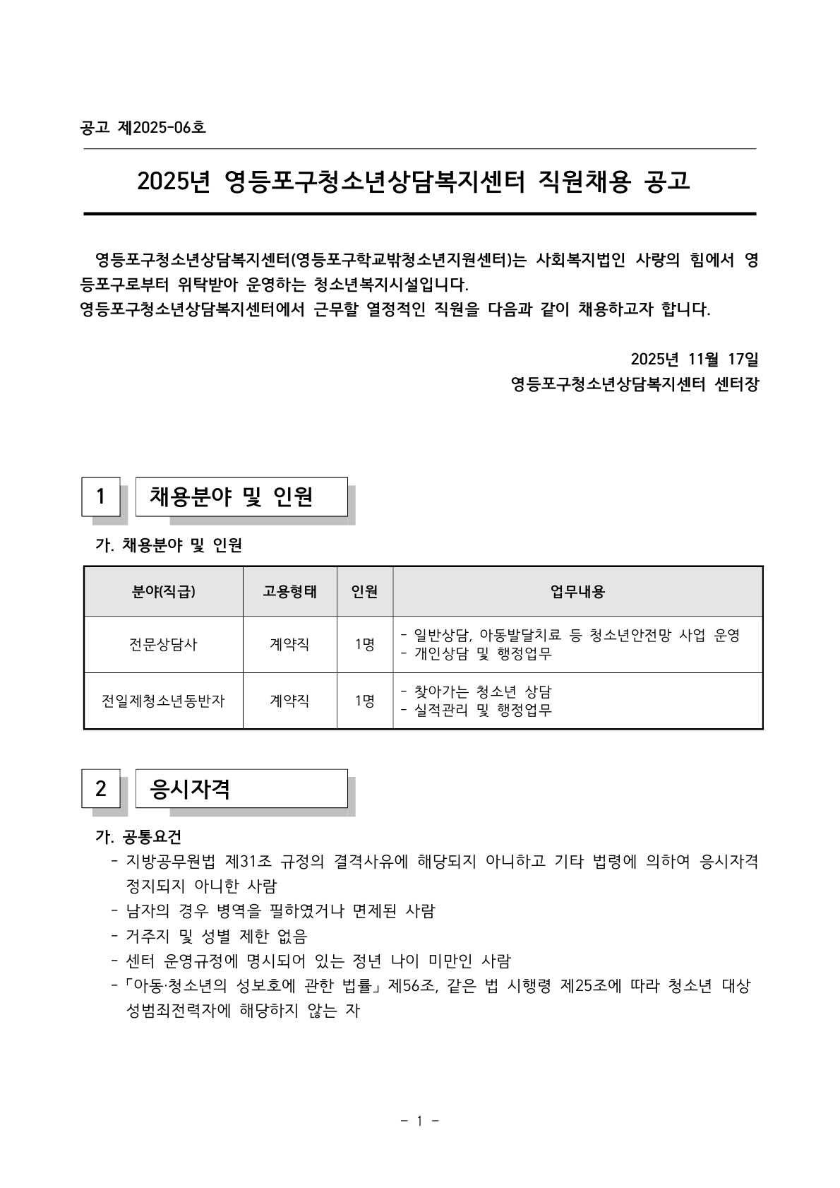 | [±¸ÀÎ] [±â°£¿¬Àå]2025³â ¿µµîÆ÷±¸Ã»¼Ò³â»ó´ãº¹Áö¼¾ÅÍ 6Â÷ Á÷¿øÃ¤¿ë °ø°í(ÀüÀÏÁ¦Ã»¼Ò³âµ¿¹ÝÀÚ, Àü¹®»ó´ã»ç) | |||