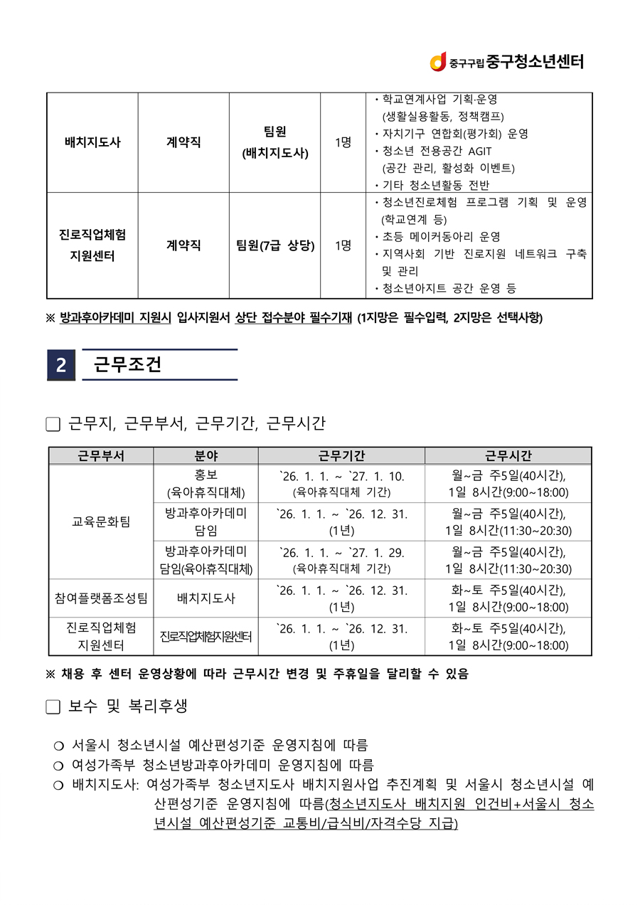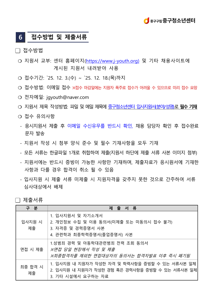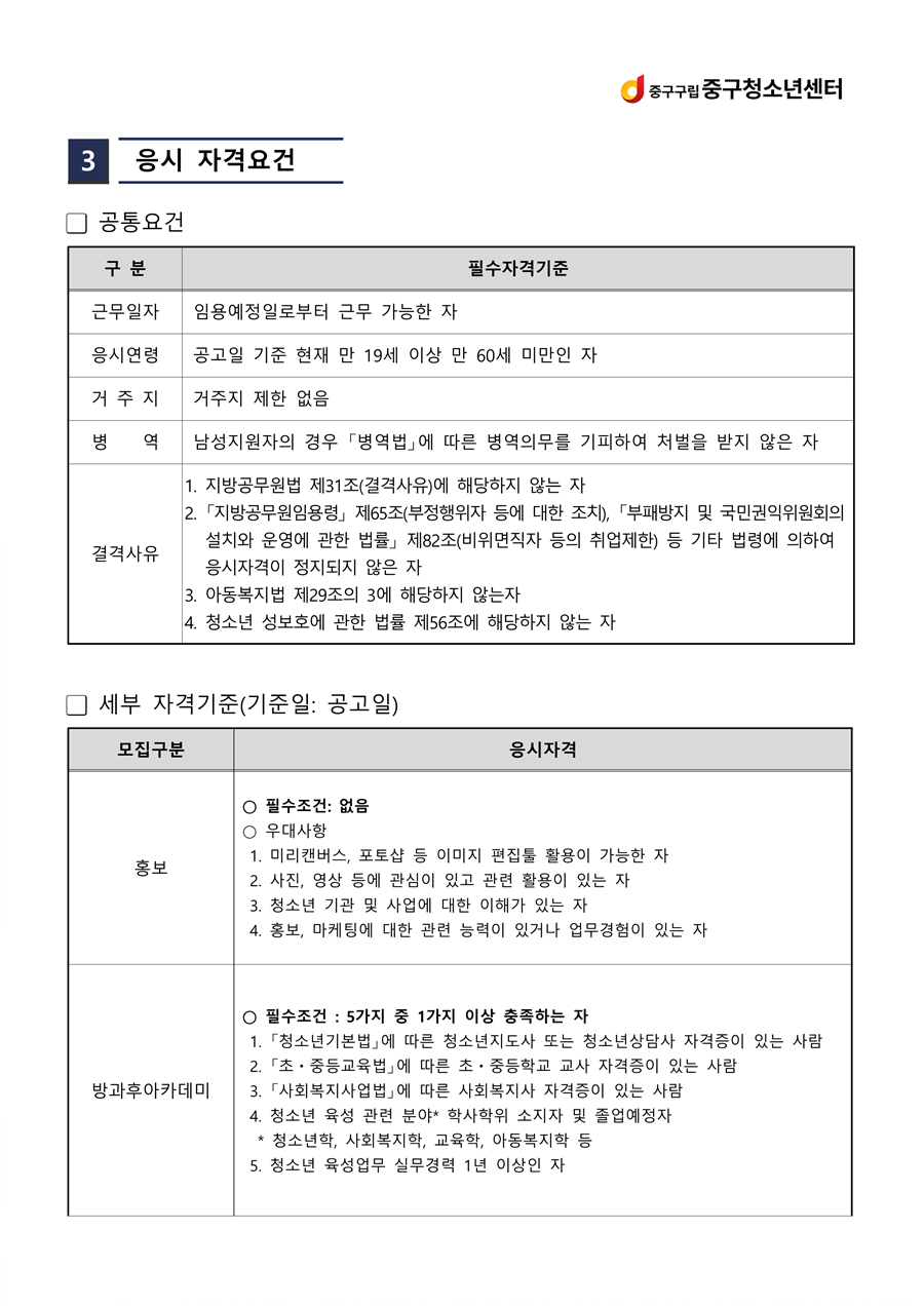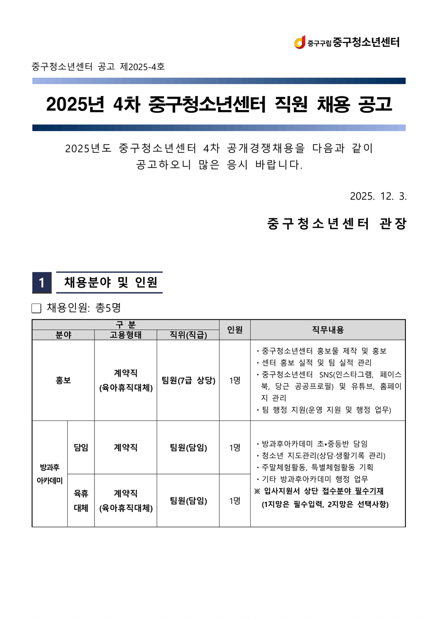| [±¸ÀÎ] 2025³â 4Â÷ Áß±¸Ã»¼Ò³â¼¾ÅÍ Á÷¿ø ä¿ë °ø°í | |||