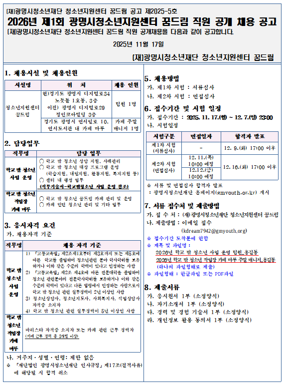 | [±¸ÀÎ] 2026³â Á¦1ȸ ±¤¸í½Ãû¼Ò³âÁö¿ø¼¾ÅÍ ²Þµå¸² Á÷¿ø °ø°³ ä¿ë °ø°í | |||