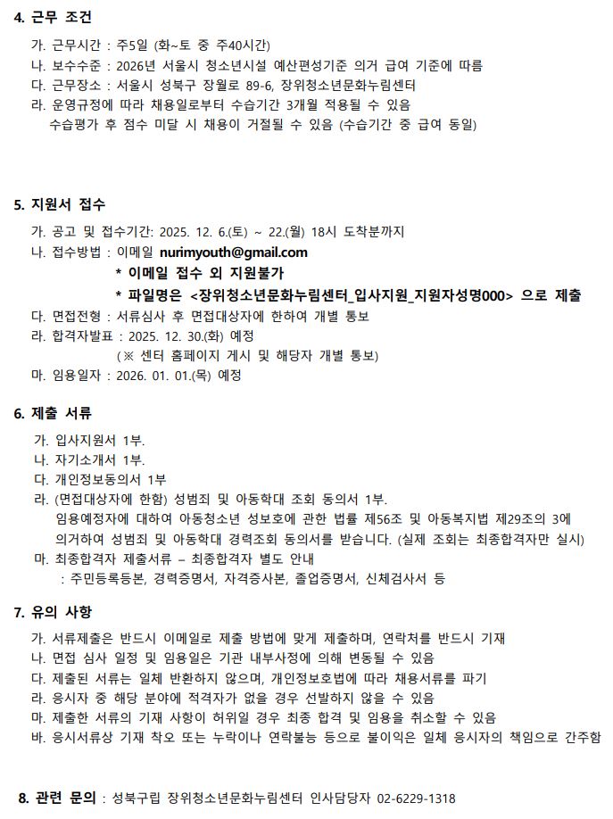| [±¸ÀÎ] (ä¿ë°ø°í Á¦2025-002È£) ¼ººÏ±¸¸³ ÀåÀ§Ã»¼Ò³â¹®È´©¸²¼¾ÅÍ Ã»¼Ò³âÁöµµ»ç ä¿ë °ø°í | |||