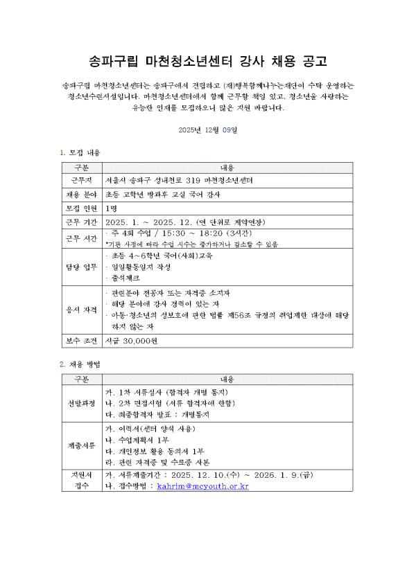 | [±¸ÀÎ] ¼ÛÆÄ±¸¸³ ¸¶ÃµÃ»¼Ò³â¼¾ÅÍ ÃÊµî °íÇг⠹æ°úÈÄ ±¹¾î°»ç ¸ðÁý | |||