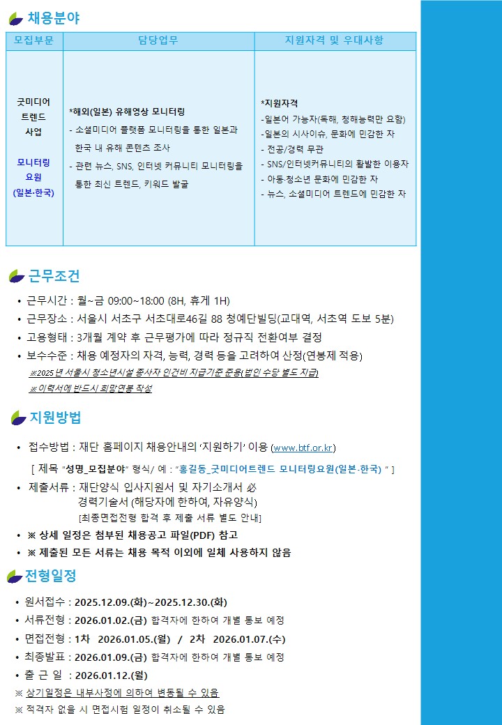 | [±¸ÀÎ] [BTF Ǫ¸¥³ª¹«Àç´Ü] ±Â¹Ìµð¾îÆ®·»µå»ç¾÷ ¸ð´ÏÅ͸µ¿ä¿ø(ÀϺ»¡¤Çѱ¹) ä¿ë°ø°í | |||