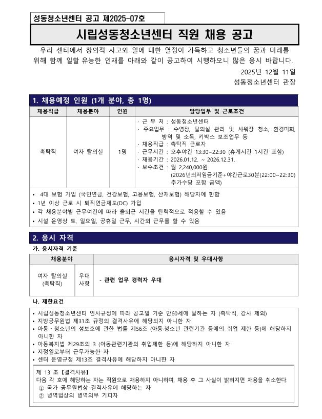 | [±¸ÀÎ] ¼ºµ¿Ã»¼Ò³â¼¾ÅÍ Á÷¿ø ä¿ë °ø°í(¾÷¹«Áö¿øÆÀ ¿©ÀÚÅ»ÀǽÇ) | |||