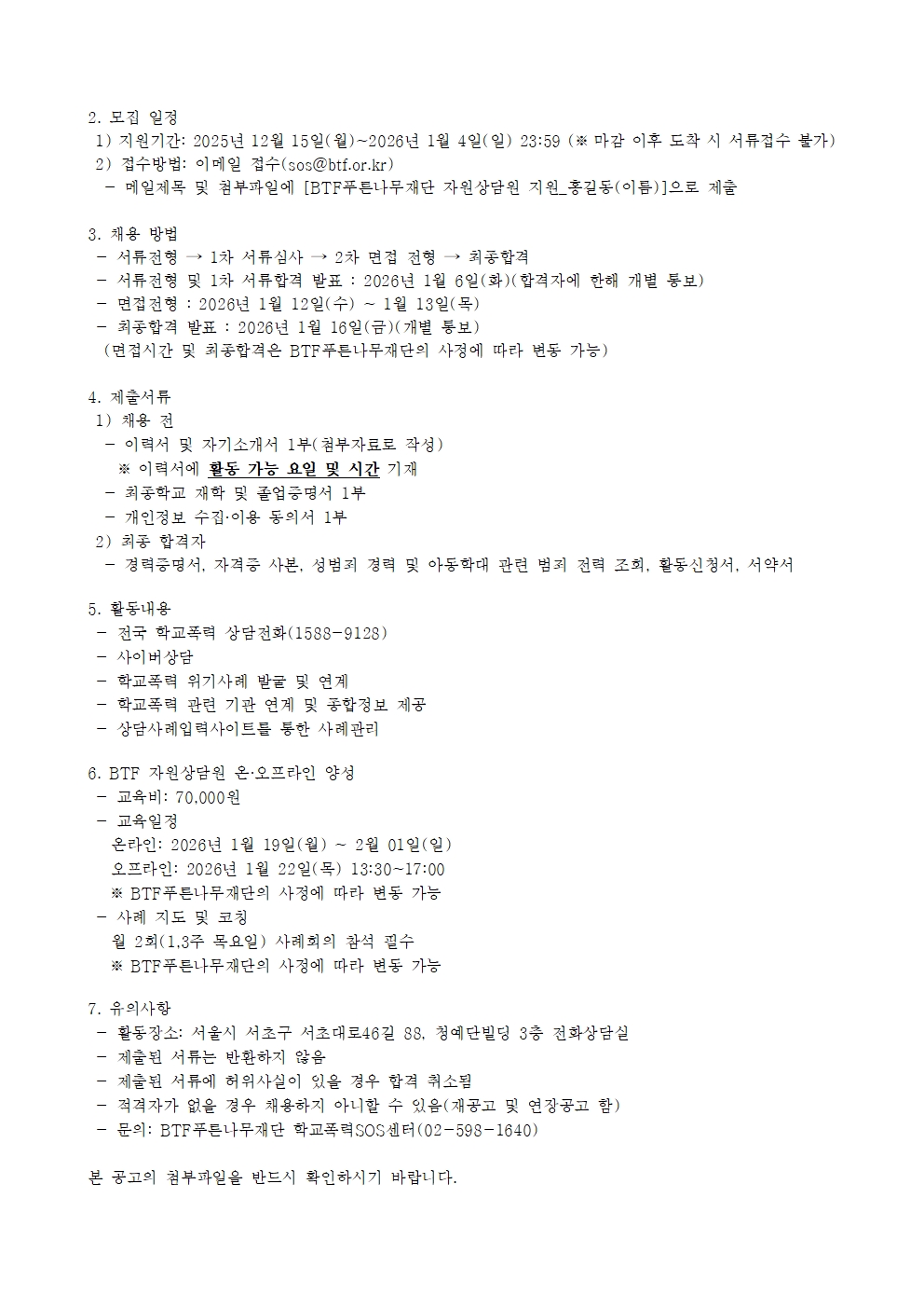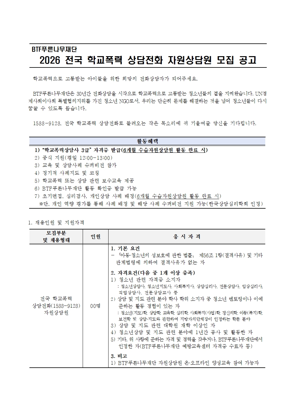 | [±¸ÀÎ] [BTFǪ¸¥³ª¹«Àç´Ü] 2026 Àü±¹ Çб³Æø·Â »ó´ãÀüÈ ÀÚ¿ø»ó´ã¿ø ¸ðÁý °ø°í¹® | |||