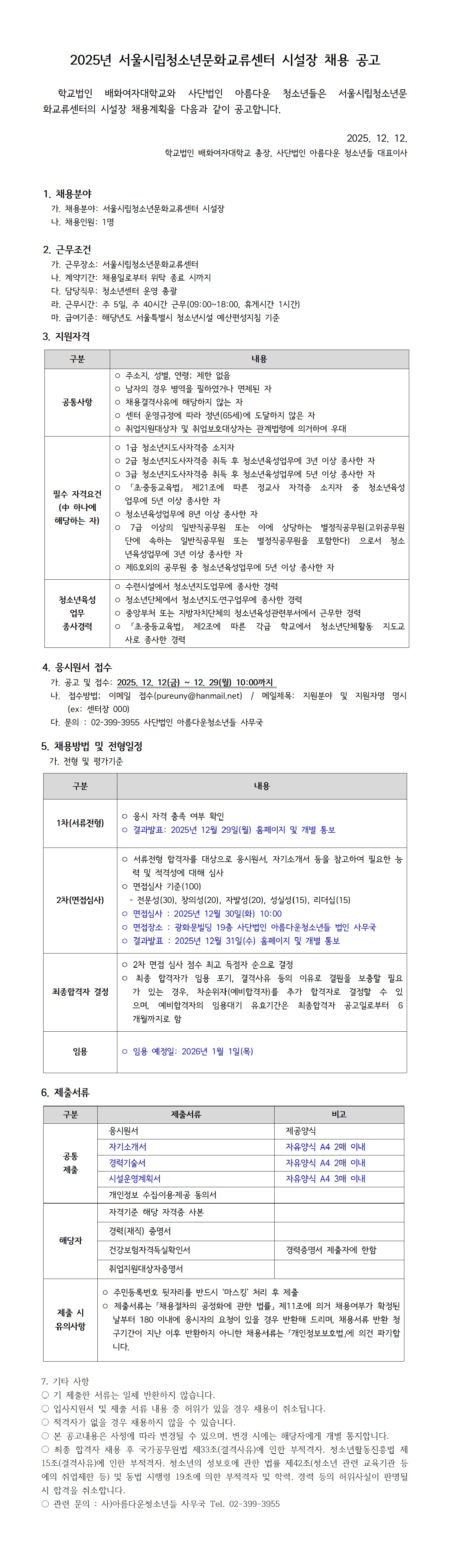 | [±¸ÀÎ] 2025³â ¼¿ï½Ã¸³Ã»¼Ò³â¹®È±³·ù¼¾ÅÍ ½Ã¼³Àå ä¿ë °ø°í | |||