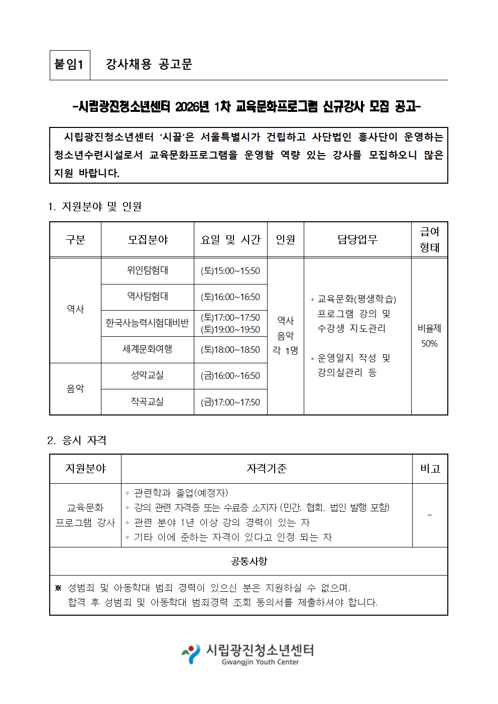 | [±¸ÀÎ] 2026³â 1¿ù ½Ã¸³±¤ÁøÃ»¼Ò³â¼¾ÅÍ ¿ª»ç, À½¾Ç ±³À°¹®ÈÇÁ·Î±×·¥ ½Å±Ô°»ç ¸ðÁý | |||