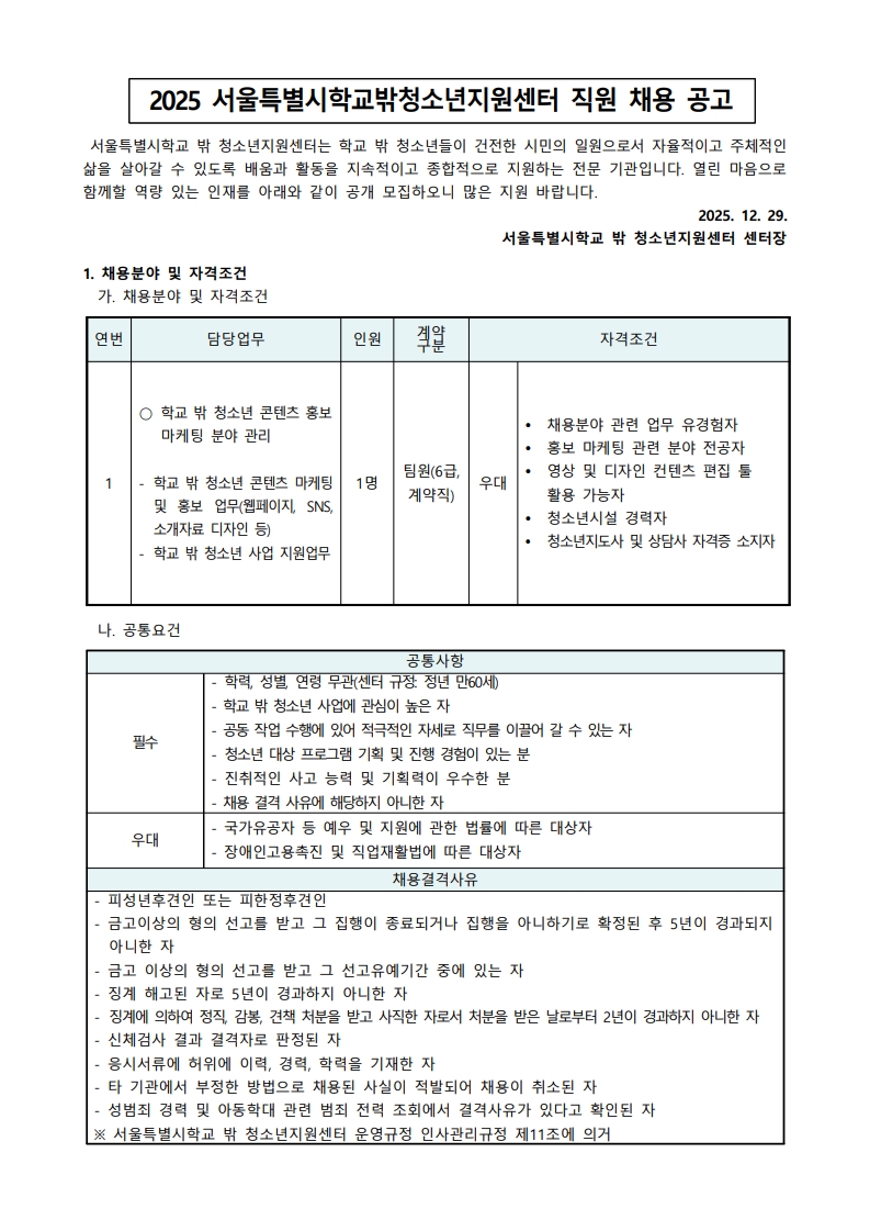 | [±¸ÀÎ] 2025³â ¼¿ïƯº°½ÃÇб³¹Ûû¼Ò³âÁö¿ø¼¾ÅÍ(°è¾àÁ÷) ä¿ë °ø°í | |||
