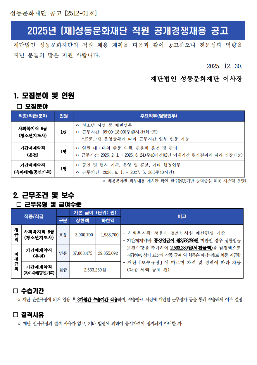 | [±¸ÀÎ] 2025³â (Àç)¼ºµ¿¹®ÈÀç´Ü Á÷¿ø °ø°³°æÀïä¿ë °ø°í | |||