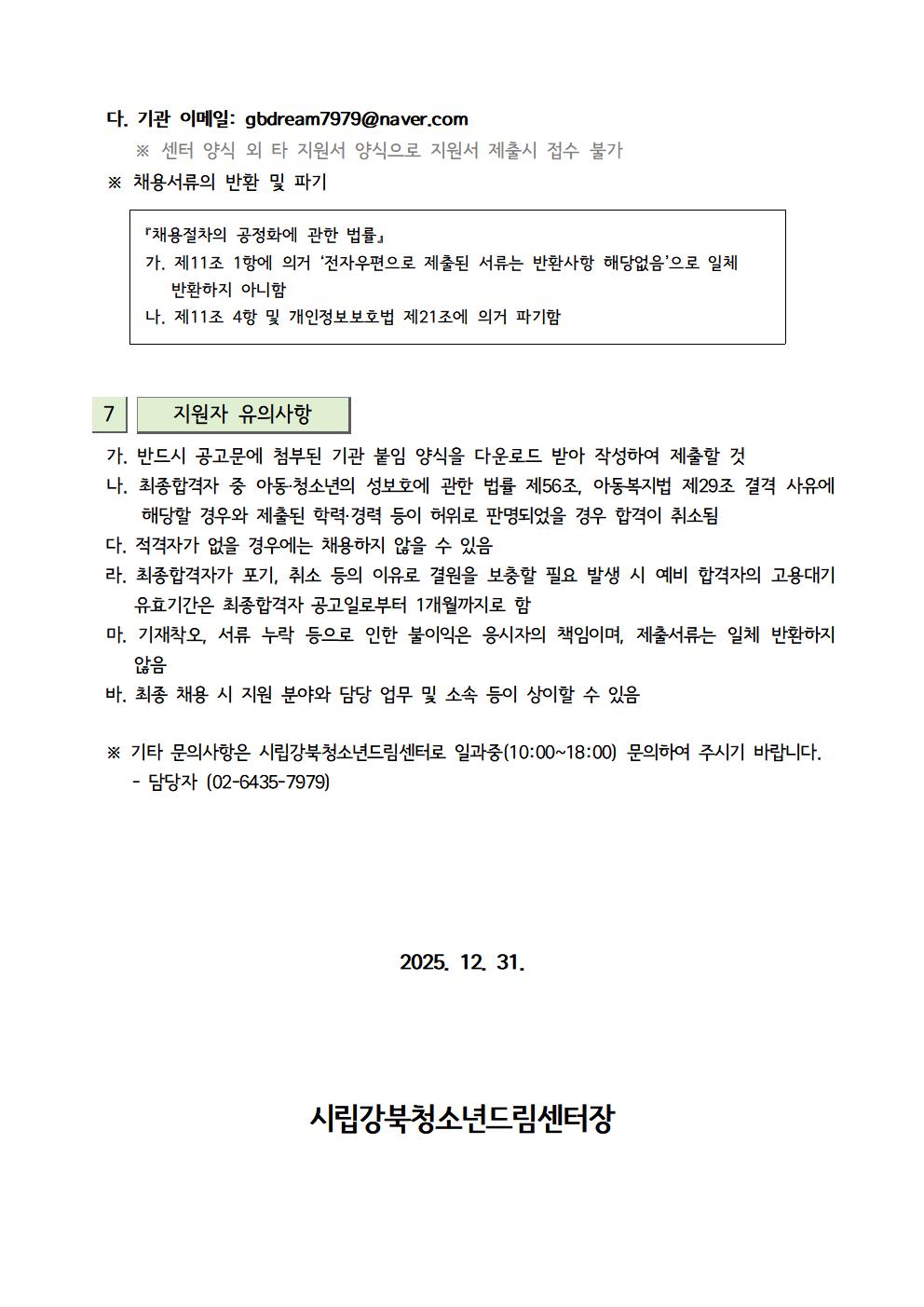 | ÀÌÀü±Û | ½Ã¸³°µ¿Ã»¼Ò³â¼¾ÅÍ Á÷¿ø(û¼Ò³â»ç¾÷ºÐ¾ß) Á÷¿øÃ¤¿ë °ø°í |