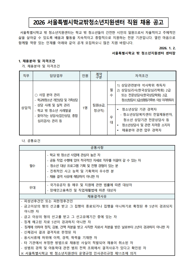| [±¸ÀÎ] 2026³â ¼¿ïƯº°½ÃÇб³¹Ûû¼Ò³âÁö¿ø¼¾ÅÍ(Á¤±ÔÁ÷) ä¿ë °ø°í | |||