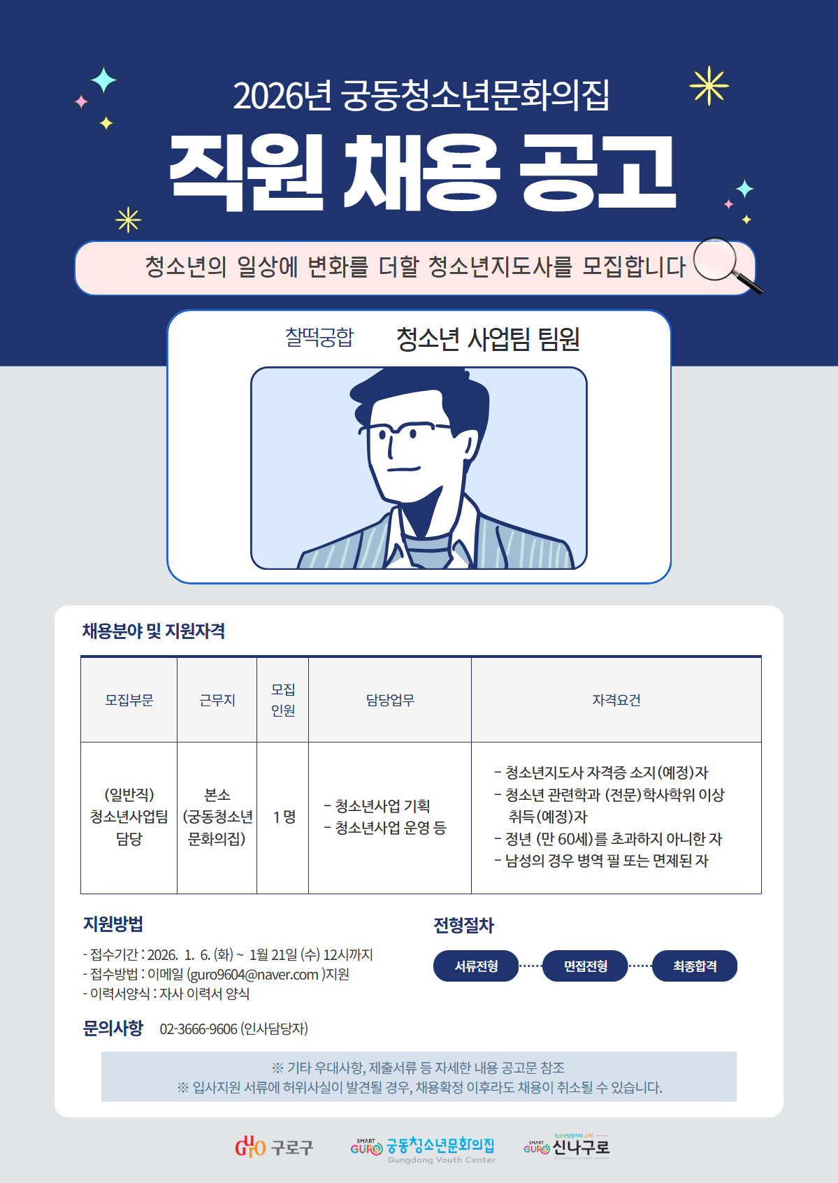 | [±¸ÀÎ] (¼öÁ¤)±Ãµ¿Ã»¼Ò³â¹®ÈÀÇÁý Á÷¿øÃ¤¿ë °ø°í(Á¤±ÔÁ÷/û¼Ò³â»ç¾÷ÆÀ ´ã´ç) | |||
