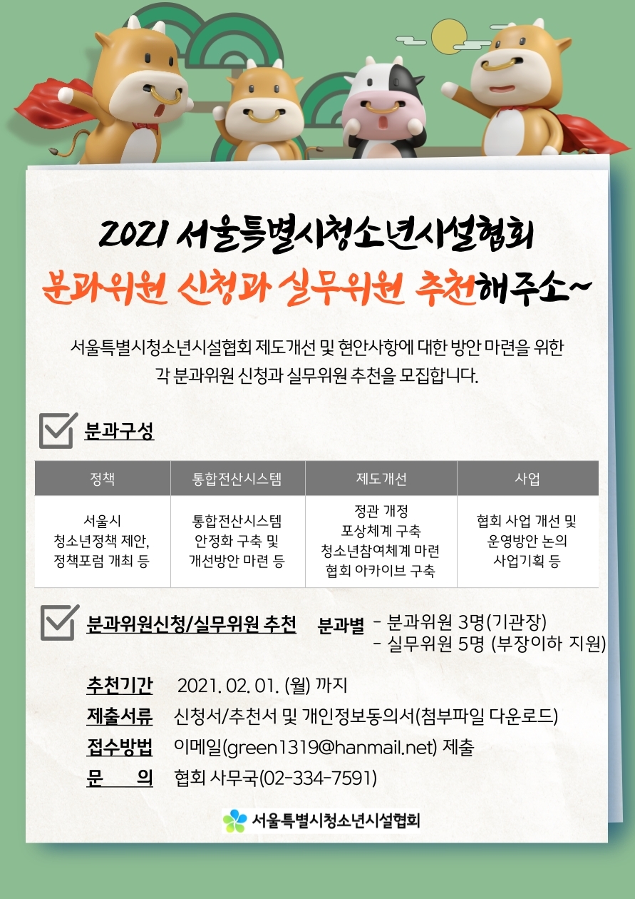 | ¼¿ïƯº°½Ãû¼Ò³â½Ã¼³Çùȸ ºÐ°úÀ§¿ø ½Åû ¹× ½Ç¹«À§¿ø Ãßõ ¾È³» | |||