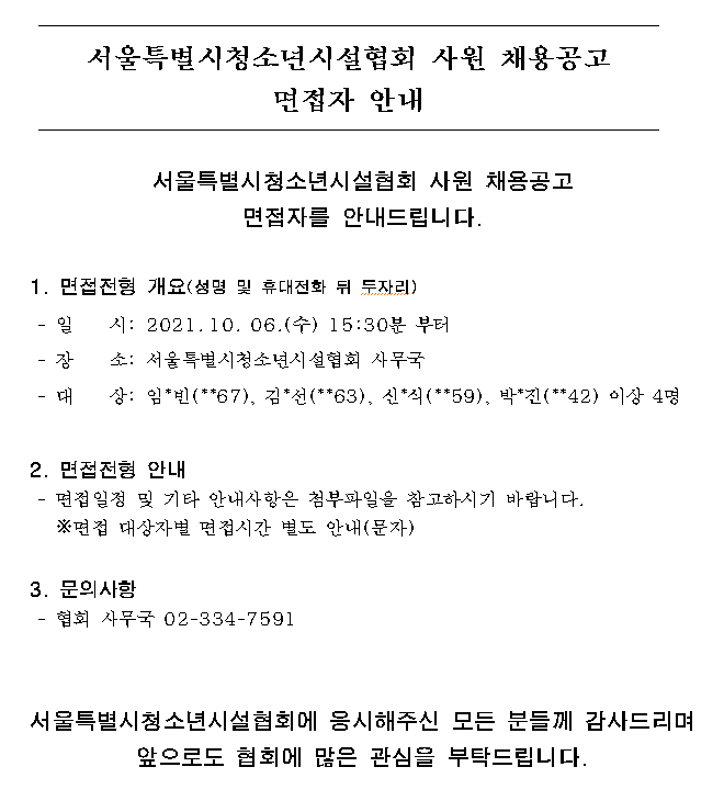 | ¼¿ïƯº°½Ãû¼Ò³â½Ã¼³Çùȸ Á÷¿ø(»ç¿ø) ¸éÁ¢ÀÚ ¾È³» | |||
