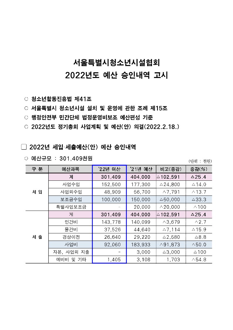 | ¼¿ïƯº°½Ãû¼Ò³â½Ã¼³Çùȸ 2022³â ¿¹»ê ½ÂÀÎ °í½Ã | |||