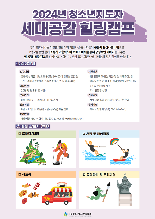 °¡. »ç ¾÷ ¸í: 2024³â ¼¼´ë°ø°¨ Èú¸µÄ·ÇÁ ³ª. ¿¬¼ö±â°£: 2024³â 9¿ù ~ 10¿ù Áß ÆòÀÏ(ÀÏ¿äÀÏ~±Ý¿äÀÏ) ÀÚÀ² ÀÏÁ¤ / 1¹Ú 2ÀÏ ´Ù. Àå ¼Ò: ±¹³»(°¿øµµ) ¶ó. ¸ðÁý´ë»ó: °øÅë °ü½É»ç¸¦ ¹ÙÅÁÀ¸·Î ±¸¼ºµÈ 20~50´ë ¿¬·Éº° È¥ÇÕ ÆÀ(¸ðµç ¿¬·É´ë Æ÷ÇÔ ±¸¼º) ¡Ø ¿¬·É ±âÁØ: ¸¸ ³ªÀÌ ÅëÀϹý[8/27(È) ±âÁØ] ¸¶. ¸ðÁýÀοø: 20¸í(ÆÀ ´ç 5¸í, ÃÑ 4ÆÀ) ¡Ø ´ë»ó±âÁØ È®ÀÎ Çʼö (÷ºÎÆÄÀÏ: 2024³â ¼¼´ë°ø°¨ Èú¸µÄ·ÇÁ ¾È³»¹®) ¹Ù. Ä·ÇÁ³»¿ë: °øÅë °ü½É»ç Ȱµ¿À» Áß½ÉÀ¸·Î ¼¼´ë°£ ¼ÒÅë°ú Çù·Â ÁõÁøÀÇ 1¹Ú 2ÀÏÀÇ ÀÚÀ² ±âȹ Ȱµ¿(°ü½É»ç ¿µ¿ª ÅÃ1) 1) Æ®·¡Å· ¹× Ä·ÇÎ: Æ®·¡Å· ¹× Ä·ÇÎ µî ÀÚ¿¬ ¼Ó üÇè Ȱµ¿ 2) ¼ÇÎ ¹× ÇØ¾çȰµ¿: ¼ÇÎ ¹× ´Ù¾çÇÑ ÇØ¾ç üÇè Ȱµ¿ 3) ½Äµµ¶ô: Áö¿ª Ư»ê¹°°ú ¸Ô°Å¸® Áñ±æ ¼ö Àմ Ȱµ¿ 4) Áö¿ªÅ½¹æ ¹× ¹®ÈüÇè: Áö¿ª¹®È¿Í ÀüÅëÀ» ¹è¿ï ¼ö Àִ üÇè Ȱµ¿ »ç. Áö¿ø»çÇ× 1) 1Àδç Ȱµ¿ºñ 10¸¸¿ø Áö±Þ(ÆÀ ´ç ÃÖ´ë 50¸¸¿ø) 2) Ȱµ¿À» À§ÇÑ °ÅÁ¡ ¼÷¼Ò Áö¿ø(°¿øµµ °¸ª½Ã »çõ¸é ¼ÒÀç / ÁÖÁß ÆòÀÏ ¼÷¹Ú Áö¿ø) ¾Æ. Âü °¡ ºñ: ¹«·á ÀÚ. ½Åû±â°£: 2024. 8. 14.(¼ö) ~ 27.(È) 14:00±îÁö Â÷. ½Åû¹æ¹ý: Á¦Ãâ¼·ù ÀÛ¼º ÈÄ ¸ÞÀÏ Á¦Ãâ(green1319@hanmail.net) Ä«. ¹® ÀÇ: »ç¹«±¹ ´ã´ç ¹Ú¹ÎÁö(02-334-7591)