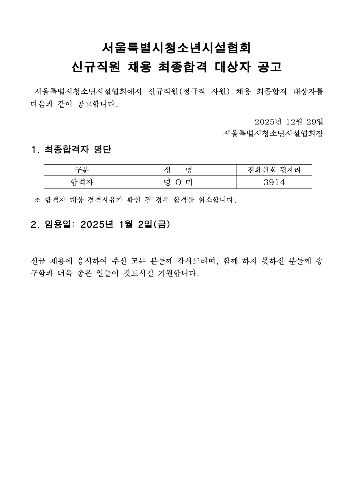 | [°ø°í] ¼¿ïƯº°½Ãû¼Ò³â½Ã¼³Çùȸ ½Å±ÔÁ÷¿ø(2Â÷) ä¿ë ÃÖÁ¾ÇÕ°Ý ´ë»óÀÚ °ø°í | |||