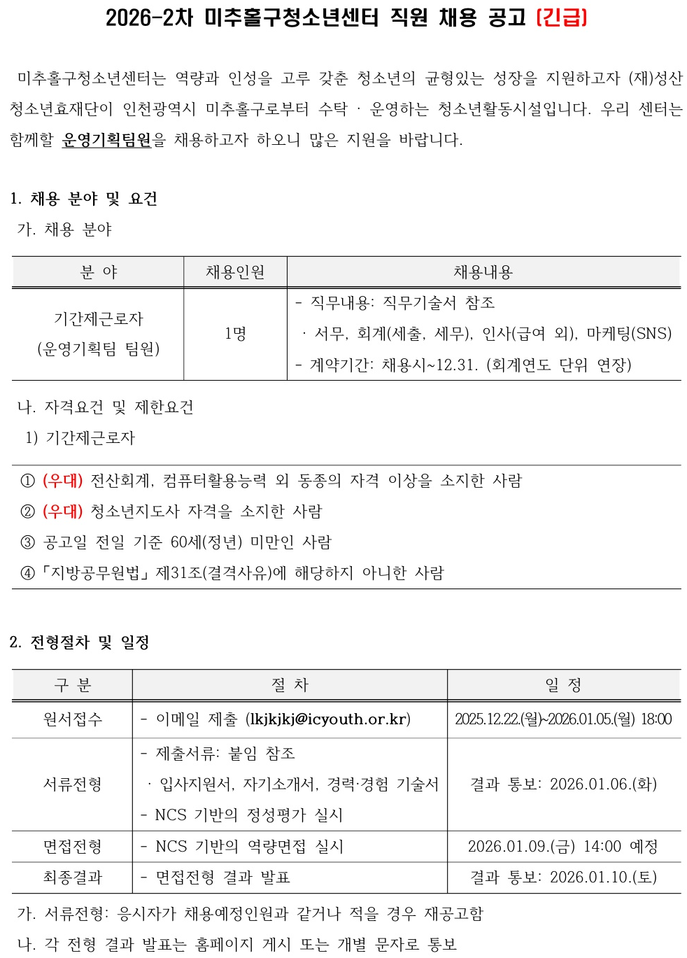 | [±¸ÀÎ] 2026-2Â÷ ¹ÌÃßȦ±¸Ã»¼Ò³â¼¾ÅÍ ¿î¿µ±âȹÆÀ ä¿ë °ø°í [±ä±Þ£Ý | |||