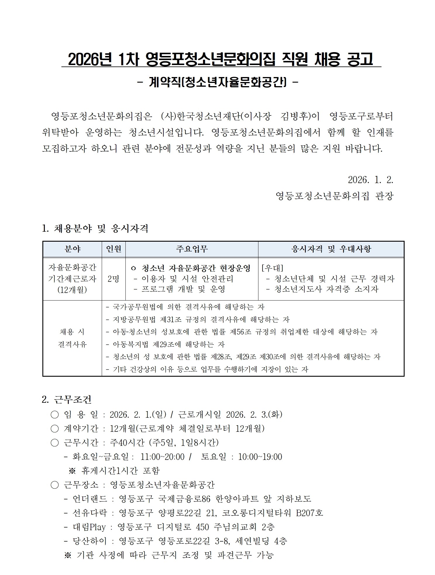 | [±¸ÀÎ] ¿µµîÆ÷û¼Ò³â¹®ÈÀÇÁý 2026³â 1Â÷ Á÷¿ø ä¿ë°ø°í(°è¾àÁ÷_û¼Ò³âÀÚÀ²¹®È°ø°£) | |||