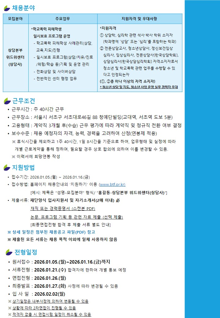 | [±¸ÀÎ] [BTF Ǫ¸¥³ª¹«Àç´Ü] »ó´ãº»ºÎ À§µåÀ§¼¾ÅÍ Ã¤¿ë °ø°í | |||