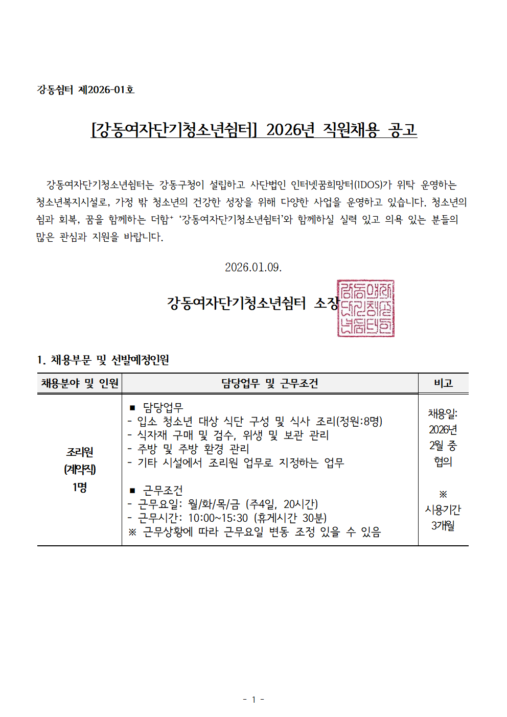 | [±¸ÀÎ] °µ¿¿©Àڴܱâû¼Ò³â½°ÅÍ 2026³â 1Â÷ Á÷¿ø ä¿ë(Á¶¸®¿ø) | |||