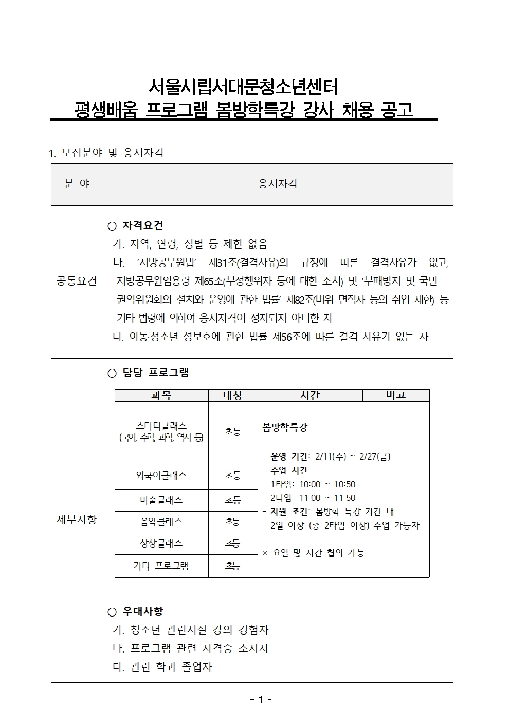 | [±¸ÀÎ] ¼´ë¹®Ã»¼Ò³â¼¾ÅÍ Æò»ý¹è¿ò ÇÁ·Î±×·¥ º½¹æÇÐÆ¯° °»ç ä¿ë °ø°í | |||