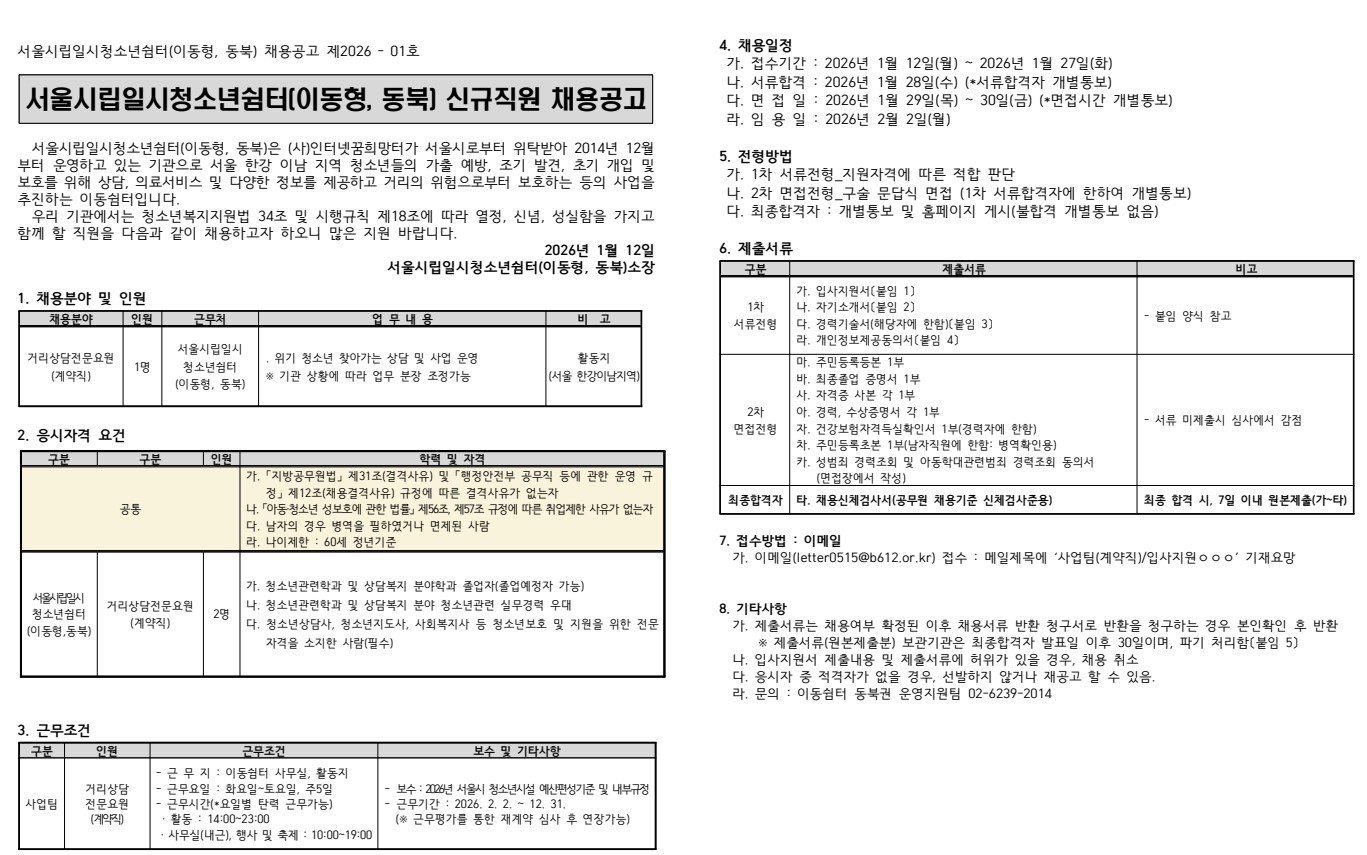 | [±¸ÀÎ] ¼¿ï½Ã¸³ÀϽÃû¼Ò³â½°ÅÍ(À̵¿Çü, µ¿ºÏ) ½Å±ÔÁ÷¿ø ä¿ë°ø°í | |||
