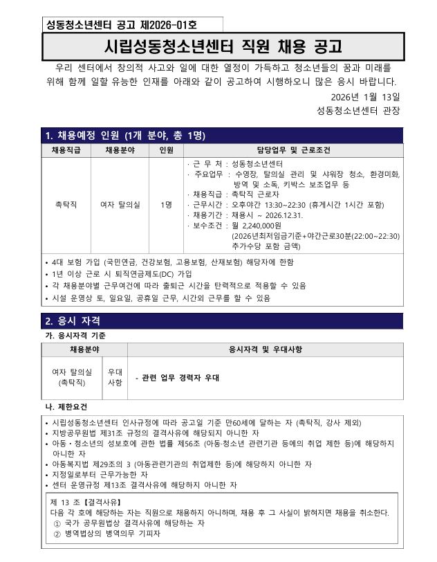 | ´ÙÀ½±Û | 2026³â ¿µµîÆ÷±¸Ã»¼Ò³â»ó´ãº¹Áö¼¾ÅÍ 1Â÷ Á÷¿øÃ¤¿ë °ø°í(¼¿ï½ÃÀü¹®»ó´ã»ç, ÀüÀÏÁ¦Ã»¼Ò³âµ¿¹ÝÀÚ) |