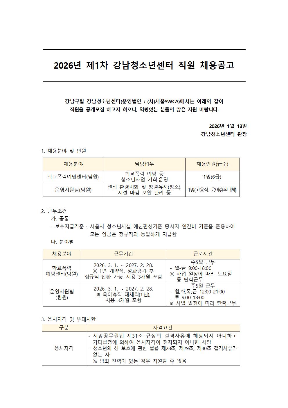 | [±¸ÀÎ] 2026³â Á¦1Â÷ °³²Ã»¼Ò³â¼¾ÅÍ Á÷¿ø(Çб³Æø·Â¿¹¹æ¼¾ÅÍ, ¿î¿µÁö¿øÆÀ) ä¿ë °ø°í | |||