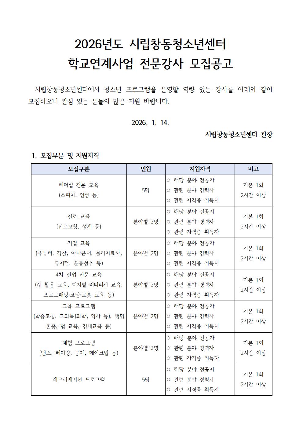 | [±¸ÀÎ] 2026³â ½Ã¸³Ã¢µ¿Ã»¼Ò³â¼¾ÅÍ Çб³¿¬°è»ç¾÷ Àü¹®°»ç ¸ðÁý°ø°í | |||