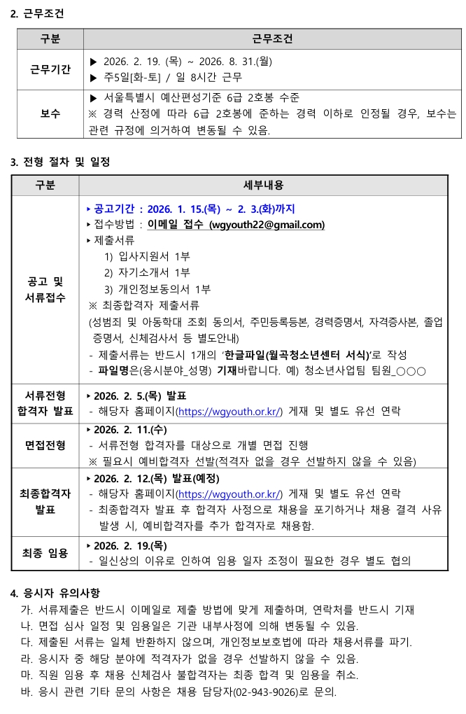 | [±¸ÀÎ] 2026³â Á¦1Â÷ ¿ù°îû¼Ò³â¼¾ÅÍ Á÷¿ø(À°¾ÆÈÞÁ÷´ëü±Ù·ÎÀÚ) °ø°³Ã¤¿ë | |||