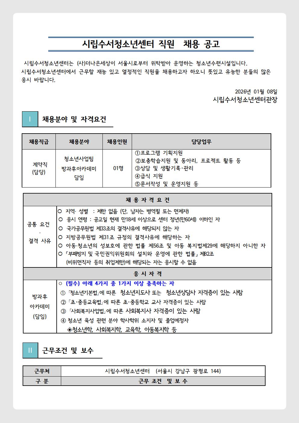| [±¸ÀÎ] [²ø¾î¿Ã¸²] ½Ã¸³¼ö¼Ã»¼Ò³â¼¾ÅÍ °è¾àÁ÷(¹æ°úÈľÆÄ«µ¥¹Ì ´ãÀÓ) ä¿ë°ø°í | |||