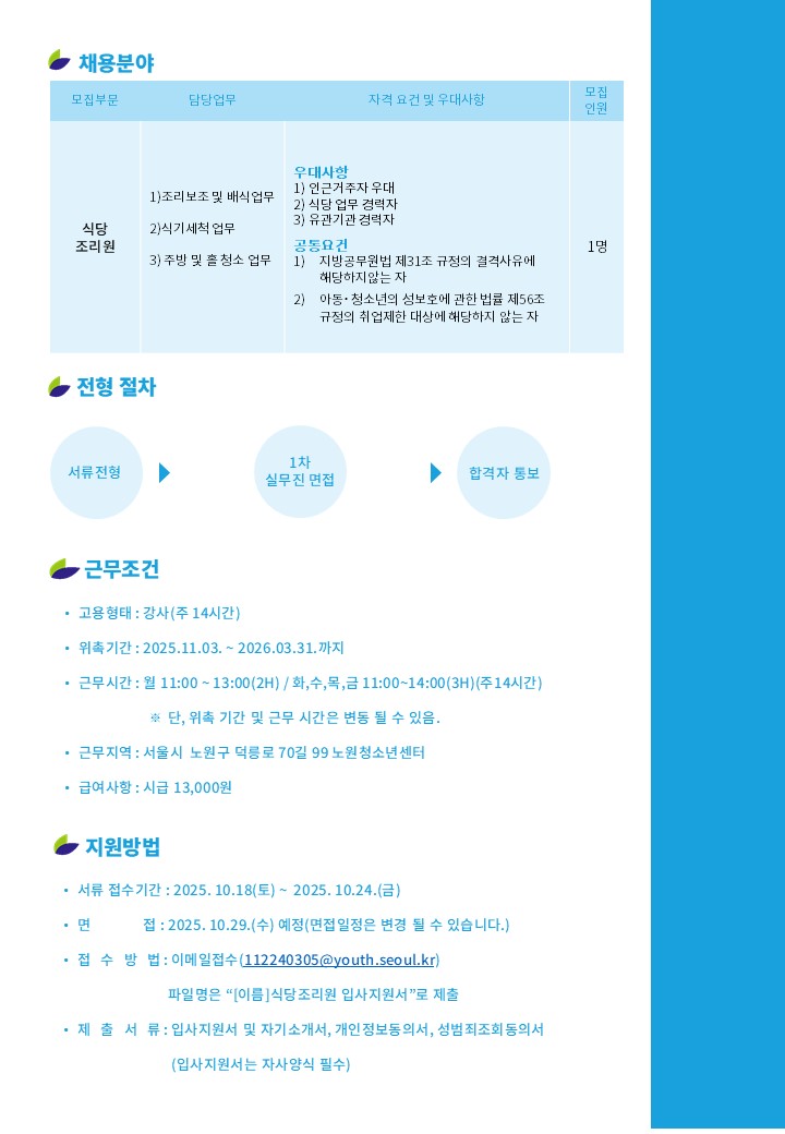 [±¸ÀÎ] ½Ã¸³³ë¿øÃ»¼Ò³â¼¾ÅÍ ½Ä´çÁ¶¸®¿ø ä¿ë °ø°í(ÁÖ 14½Ã°£) | |||