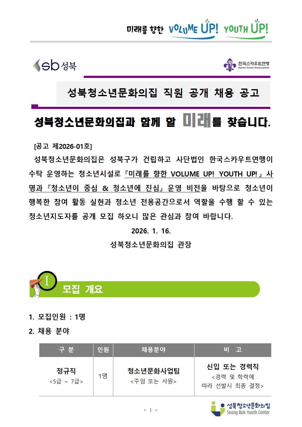 | [±¸ÀÎ] 2026³âµµ ¼ººÏû¼Ò³â¹®ÈÀÇÁý û¼Ò³â¹®È»ç¾÷ÆÀ Á¤±ÔÁ÷(5±Þ~7±Þ) Á÷¿ø °ø°³Ã¤¿ë °ø°í | |||