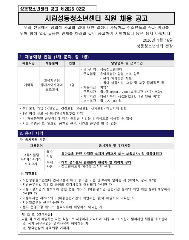 | [±¸ÀÎ] ¼ºµ¿Ã»¼Ò³â¼¾ÅÍ Á÷¿ø ä¿ë °ø°í(±³À°Áö¿øÆÀ º¸Á¶±³»ç) | |||